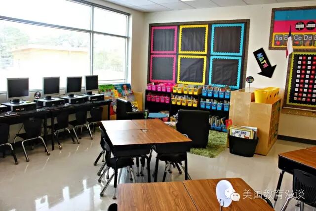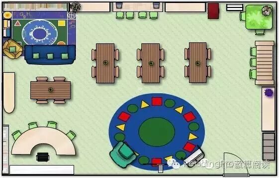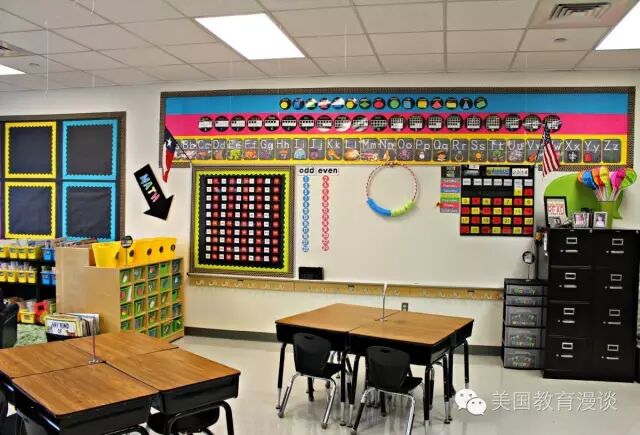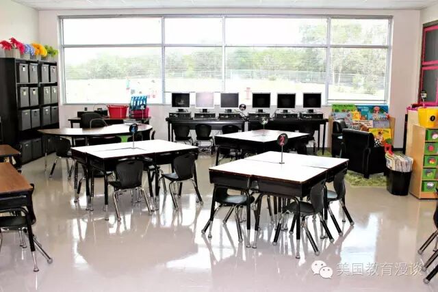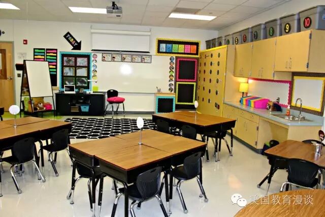 传统的中国小学教室格局是黑板讲台在教室最前方,下面一排排整齐的书桌和板凳。美国小学教室格局则大为不同,一般老师会在开学前对教室进行规划并进行分区。下面是美国小学教室分区平面图: