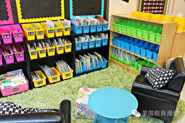 彩色塑料收纳筐将图书分类,颜色跟后面的展板边框呼应。