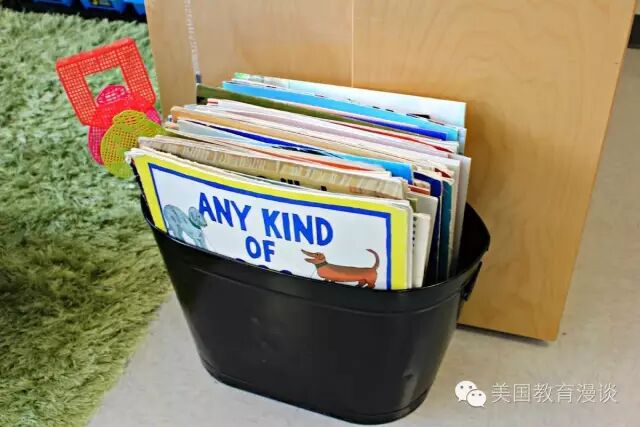 图书角书架的角落里有一个大的塑料桶,用来放那些很大的书。