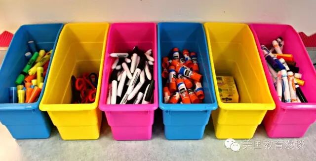 彩色的塑料收纳筐里分别装了不同的文具。(颜色和后面的小展板呼应,明亮又有秩序)