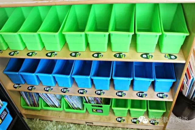 每个空的收纳箱对应一个号码 1-21,是属于不同学生的。学生把自己没读完或者想要读的书放在里面。
