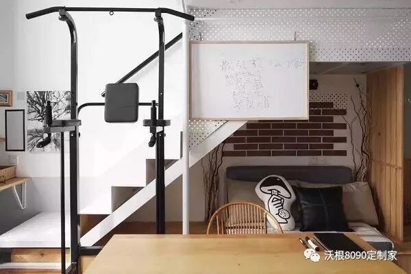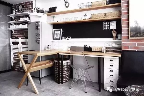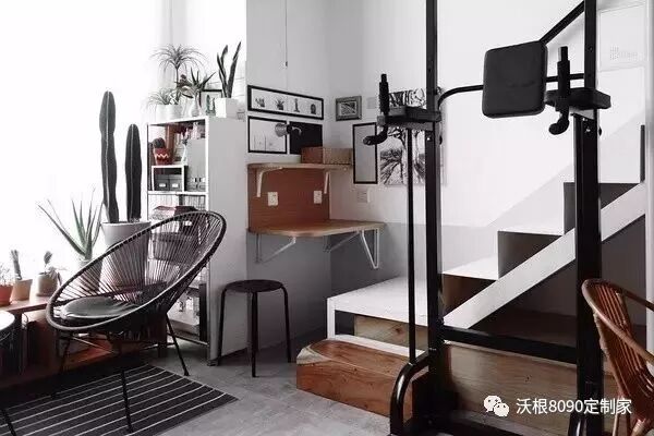 再比如,楼梯下这个书桌设计,利用第二级台阶高度差作为凳子,设计出小书桌,把凳子和台阶的功能二合一。这样就相当于合并了一个凳子的占地面积。