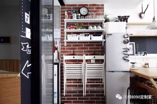 还有我家冰箱位置。 左边靠墙,右边紧邻餐桌和白色搁板。冰箱上部,后半部分紧贴着长长的搁板,前半部分放硅胶洗衣篮。前后左右上上下下没有一丝空间是随意浪费的,镶嵌成一个完整紧密的整体。