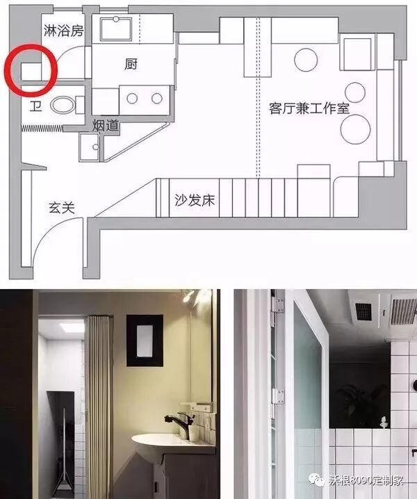 看下图红圈中,我家淋浴房与一楼卫生间之间这个小空间,本来是个很尴尬的存在。我把它设计成---------上半截朝淋浴房开口,放沐浴露等日用品;下半截朝卫生间开口,放扫帚等。这样,就实现了朝向不同,功能不同的两个小空间。相当于把它们上下镶嵌在一起。