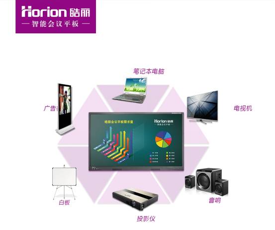 皓丽会议平板集电脑、投影仪、电子白板、电视、、音响于一体,采用4K高清大屏,融合高清显示、人机交互、多媒体信息处理和网络传输等多项技术,轻松实现触摸书写、多屏互动、远程会议等功能。