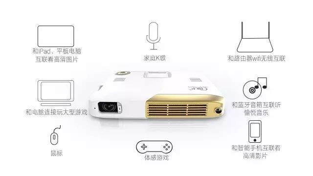 不仅如此,它可以将画面投射成300吋的超大画面,还可搭配手机、平板、摄像头、麦克风、传感器、蓝牙以及WiFi,更可独立运行各类安卓系统软件。