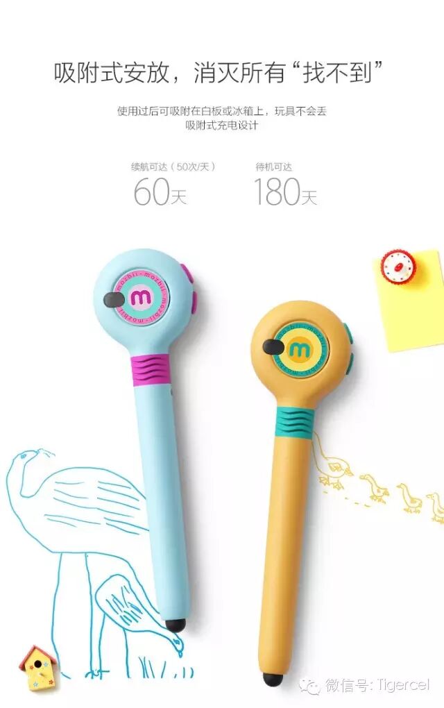 Mozbii的外观设计成讨喜的棒棒糖模样,笔头还内置了磁铁,能够随意附着在白板或者冰箱上。并且为了小孩子特殊的设计,其在USB端口也同时内置了磁铁,只要方向正确就能够自动吸附笔头,充电十分方便。