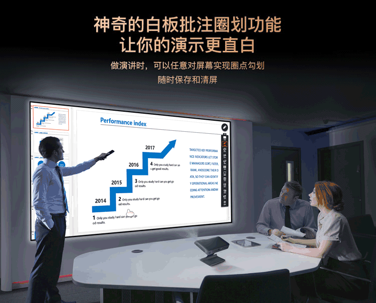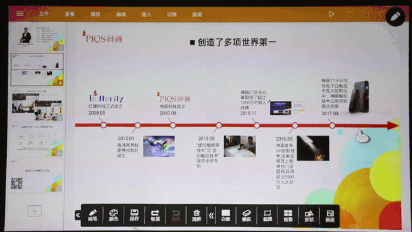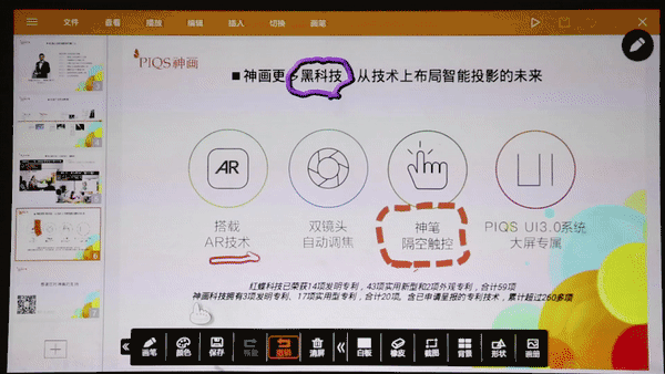 比如触控投影在PPT演示过程中,使用商务助手的笔画功能可以自由批注,商务助手可以放在屏幕的边缘位置,但是却不会影响正常的内容演示。比起拿纸张做笔记,更快捷方便。