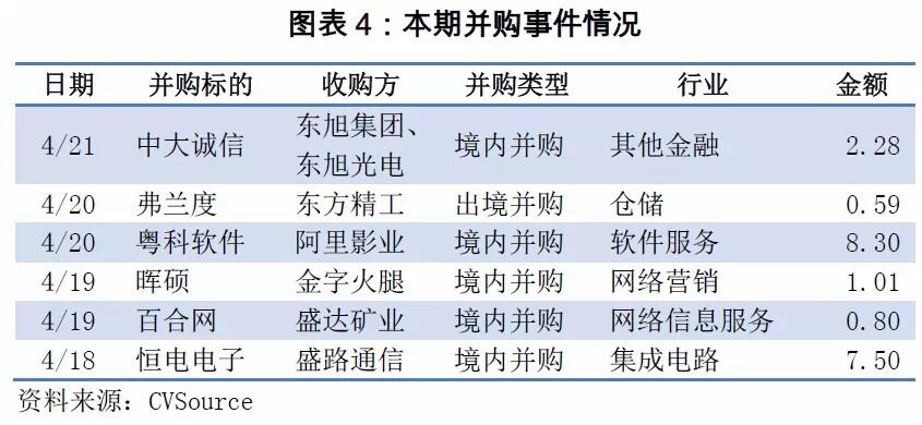 并购:本期共宣布并购事件6项,并购交易总额20.48亿元,其中出境并购1项,境内并购5项。