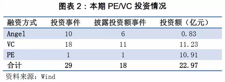 投资:本期PE/VC共披露了29个投资项目,其中天使投资项目10个,VC项目18个,PE项目1个。其中18个项目披露了金额,总投资额22.97亿元。