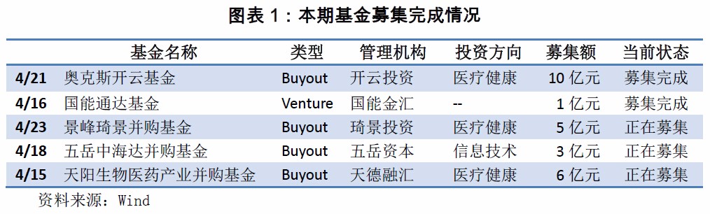 募资:本期有2家基金完成募集,募资总额11亿元;有3家基金宣布开始募集,拟募资总额14元。5家基金,除了奥克斯开云基金,其余都是由上市公司联合创投机构设立的。这5家基金按类型划分,并购基金4家、风险基金1家。在投资方向上,有3家基金涉足医疗健康产业;其余2家基金中,五岳中海达并购基金主要投资信息产业——卫星导航、地理信息、海洋探测设备、智慧城市等领域,国能通达基金未披露具体投资领域。