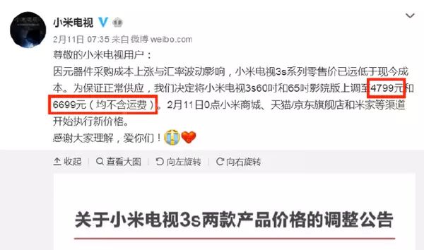 2月11日,小米电视官方微博发布信息称,由于元器件采购成本上涨与汇率波动影响,小米两款电视的价格均将上调。4天前,小米电视已经发布了另两款电视涨价的信息。下图为面包财经对小米电视官微的截图:
