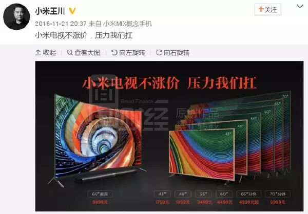 其实,更值得关注的是小米电视此前的涨价。小米王川还在微博上贴出“小米电视不涨价,压力我们扛”的广告,神补刀。然而,最终小米也没扛住。