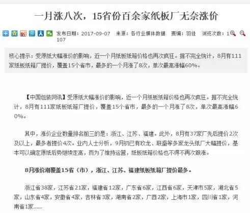 专家分析认为,由于造纸行业下游产业大多产能过剩,企业轻易都不敢调价,因此消费者目前感受还不太明显。但原料纸价如果继续上涨,企业难以消化成本上涨压力,最终可能会向消费端传递。
