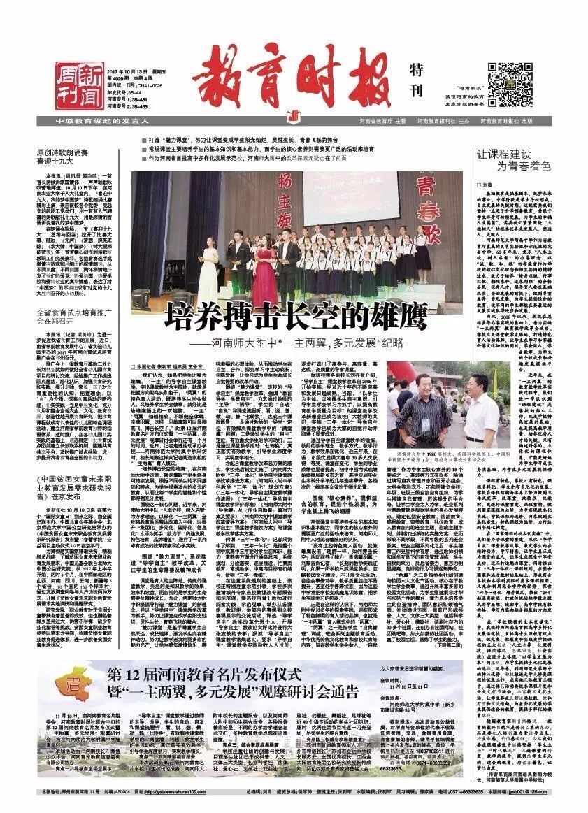 “我们认为,如果把学生比喻为雄鹰,‘一主’的导学自主课堂教学,突出课堂教学为主阵地,就像是把握方向的鸟头和躯干;‘两翼’的特色育人活动,既培养学生学会做人,又培养学生学会做事,就好比是给雄鹰插上的一双翅膀。‘一主’‘两翼’相辅相成,不断健全体魄、丰满羽翼,这样一只雄鹰就可以展翅高飞、搏击长空了。”距第12届河南教育名片发布仪式暨“一主两翼,多元发展”观摩研讨会举行还有一个月的时间,近日,记者走进活动承办学校——河南师范大学附属中学采访时,校长刘黎这样向记者阐述该校的“一主两翼”育人模式。