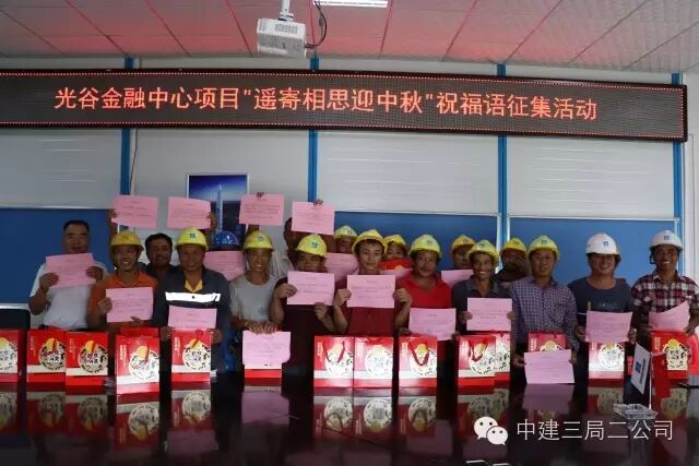 中秋节,又称月夕、秋节、仲秋节、八月节、八月会、追月节、玩月节、拜月节、女儿节或团圆节,是流行于中国众多民族与汉字文化圈诸国的传统文化节日,时在农历八月十五;因其恰值三秋之半,故名,也有些地方将中秋节定在八月十六。在中秋佳节即将到来之际,中建三局二公司各家单位又行动起来了,用各自独特的方式与工友、职工及其家属共同欢庆中秋佳节。近日,中建三局二公司海外事业部为310名海外项目员工送去了金秋祝福,并为所有武汉市外的员工寄送月饼快递到家,汉内员工则凭月饼券领取。目前,大部分员工家属已收到月饼,尤其是今年新开工的巴基斯坦PKM项目,很多员工都是第一次收到事业部寄的月饼,既惊喜又感动。同时,中建三局二公司海外事业部今年特意制作了由事业部总经理和执行总经理联合签名的“感恩有您”中秋贺卡,随月饼一同送出。代表不能常回家看看的海外将士对父母、对家人最诚挚的祝福和问候。9月11日下午,中建三局二公司北京公司秦皇岛茂业中心项目举办了一场别开生面的包饺子创意比赛,欢度中秋。比赛中,造型独特风格迥异的饺子让项目部笑声连连。有蒜头造型的、三角形的、蝴蝶结的、糖果的……还有娃娃头造型的。中建三局二公司北京公司平谷住宅项目开展中秋节工友手绘“微家书”活动。