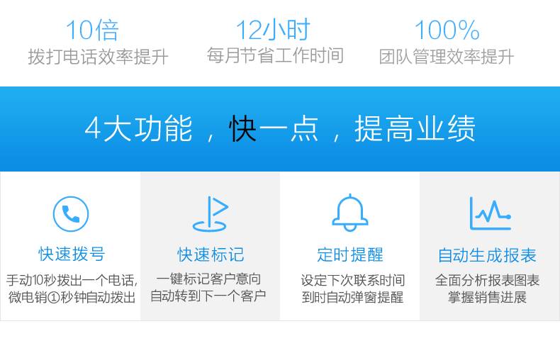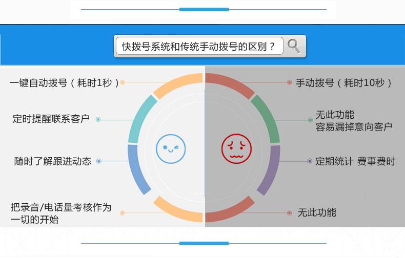 快拨号是专门针对以电话营销为主要营销渠道的企业而推出的营销解决方案,实现一键外呼高效跟进客户,实现流程化工作,提高业务员工作效率;实时统计员工的通话量、通话时长、电话效果、客户维护情况,有效评估业务员工作能力,抽出优秀业务员,构造模型,进行复制;提高业务员整体水平,提高业绩。