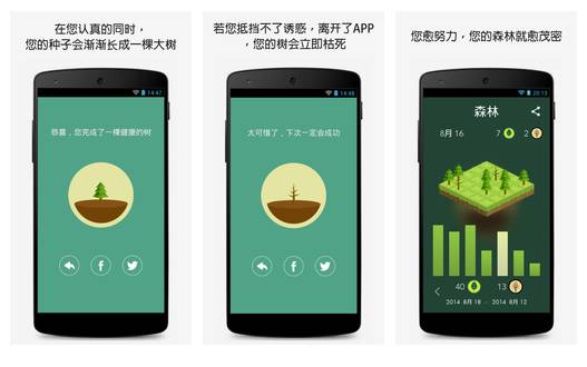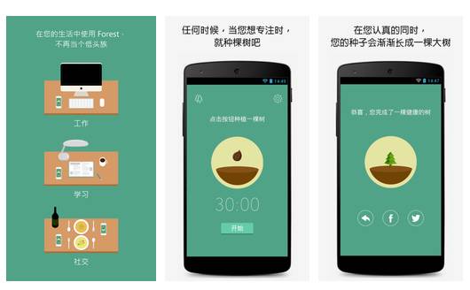 在Forest里,每次开启一个25分钟的专注时间,你就开始在种一棵树,如果这个过程中你去碰手机,这个树就枯死。