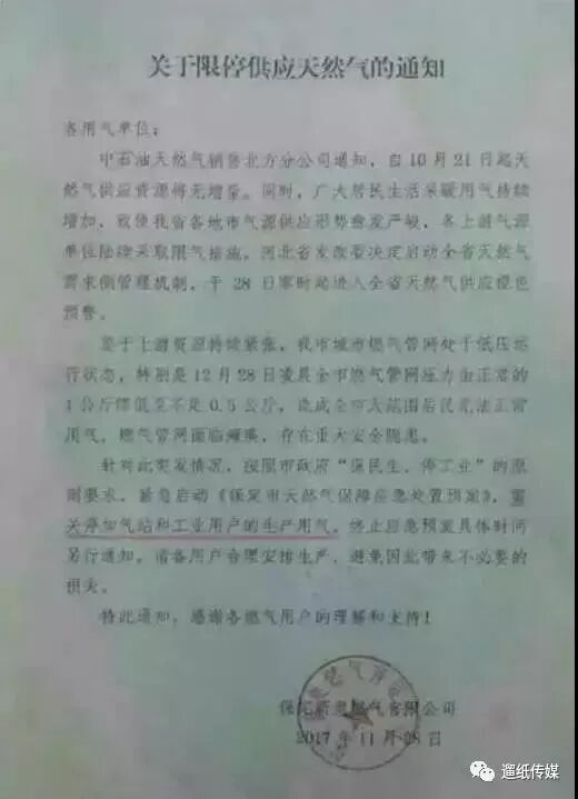另一方面,受全国大范围“煤改气”、大气污染防治和冬季用气量激增等因素影响,今年天然气出现供应不足、价格高昂的局面,为此,自十一月底开始,不少地区都出现了“限气”通知涵,对工业用户进行限停、限供。