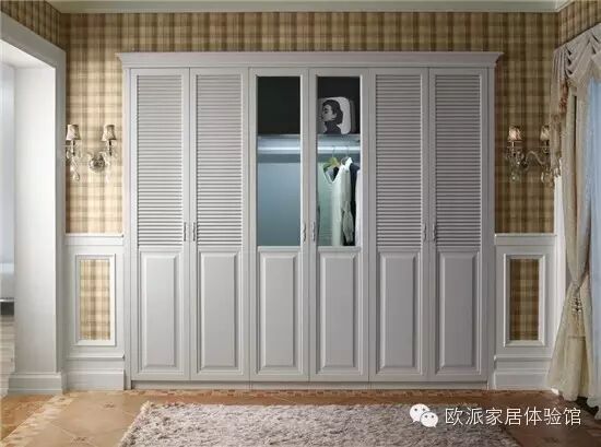 做满墙壁,并且到顶的入墙式衣柜,节省卧室空间。四门设计,容量巨大,一年四季的衣服都可以很好的收纳。
