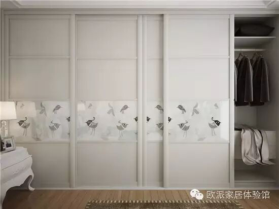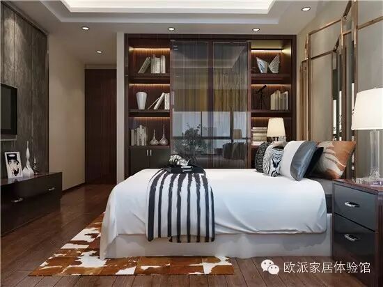 一体式衣柜设计,让空间得到最大利用,玻璃与实体的结合,虚实朦胧。小隔板设计,让书籍、相册得到合理放置。