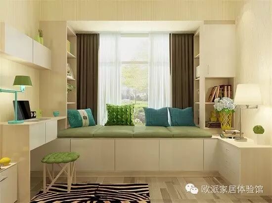 于床尾与窗户/墙壁之间定制一个收纳柜,既可以收纳杂物,又可以用来做学习区和工作区。