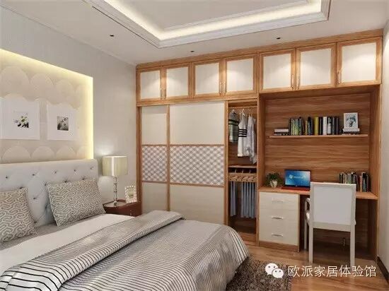衣柜、梳妆台、工作区一体式组合,一面墙打造出多个功能区,一次满足多个愿望。