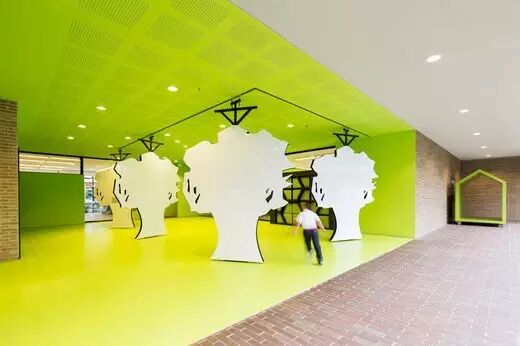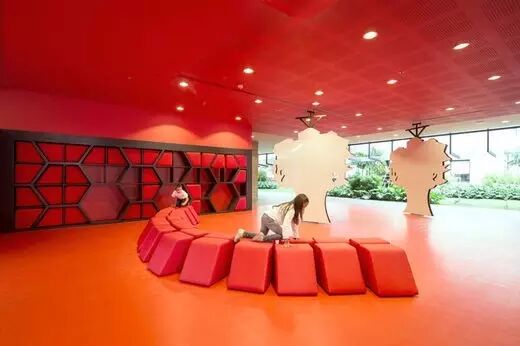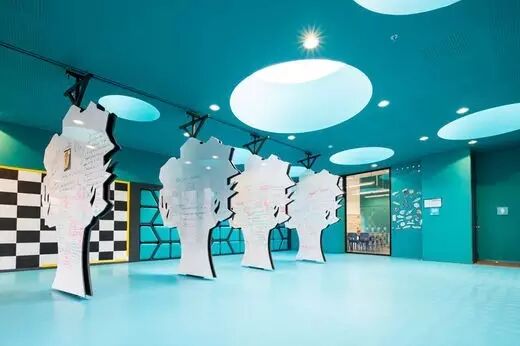 蓝色、绿色、黄色和红色被应用在不同的空间中,象征着学校不同的区域。一些墙面上填充着座垫,孩子们可以从墙上取出这些垫子坐在地上,也可以像建筑结构一样搭建“雕塑”。每次使用后,这些垫子可以放回到墙壁的几何格子中,也可以创新出一种新的摆放模式并在实践过程中解决他们自己所遇到的疑惑。悬挂式的树状白色画板具有双重角色功能,孩子们可以绕着画板玩耍,也可以拿笔在白板上绘画。